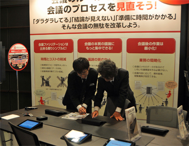 iPadを活用して会議をペーパーレス化 また、「Customer's Fair 2011」開催と同時に、専用の管理サーバーから無線LAN経由で会議資料をiPadへ配信し、会議のペーパーレス化を図るソリューション「SmoothMeeting(スムースミーティング)」の提供を開始した。認証による接続制限やデータ漏えい対策などを実現したセキュリティ機能を備える。