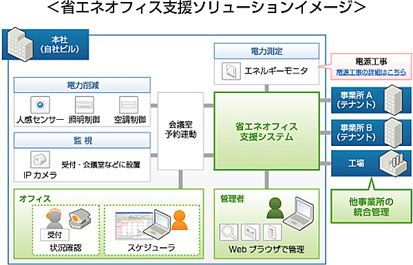 省エネオフィス支援ソリューションイメージ 「省エネオフィス支援ソリューション」は、電力測定、データの見える化、照明・空調の制御、外部機器との連携が可能で、これらの一貫した処理を自動化して法令に対応した報告書を作成できる。電力測定はビルやフロア単位ではなく居室・設備単位で、スケジューラー(会議室予約)や人感センサーと連動した照明・空調の自動制御によって、会議室稼働率の改善や運用コストが削減できる。また、大規模なカスタマイズが不要で、低コストで既存の施設にも導入でき、小規模オフィスにも対応する。