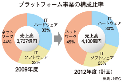 プラットフォームビジネスユニットは、サーバーやストレージ、PBX(構内交換機)などの情報・ネットワーク機器とミドルウェアの開発・販売を担当する事業部門で、2009年度の売上高は3737億円、全売上高の10%強を占める。内訳をみると、サーバーやストレージなどの「ITハードウェア」が33%で「ITソフトウェア」が23%、「ネットワーク」が44%。海外売上高比率は09年度が25%だが、ネットワーク事業だけをみれば50%を海外市場での売上高が占めている。ただ、営業損益は17億円の赤字に転落している。2012年度を最終年度にした中期事業計画では、同ユニットで売上高4100億円、営業利益200億円を目指す計画を立てた。国内は年率1%、海外は同9%で伸ばす考え。売上高の内訳はITハードウェア事業が30%、ITソフトウェアが25%、ネットワークが45%とした。