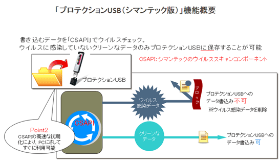 「プロテクションUSB(シマンテック版)」シリーズは、書き込まれたデータをスキャンし、ウイルスに感染したファイルを即座に削除する「ウイルス監視機能」を搭載したデータ授受用のUSBメモリ。感染したファイルの書き込みをブロックすることで、データ移動先機器へのウイルス感染を防ぐ。