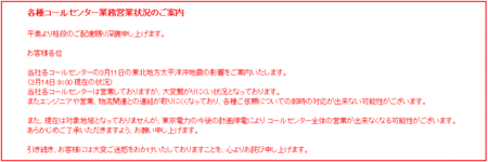 しかし、顧客対応などのコールセンターでは、一部で支障が出ている。大塚商会(大塚裕司社長)は、3月14日現在、つながりにくい状況になっている。同社は、エンジニアや営業、物流関連との連絡が取りにくくなっており、即時対応ができない可能性を示唆している。また、現在は東電の計画停電の対象地域となっていないものの、今後の計画停電の状況によっては、コールセンター全体の営業が難しくなる可能性があるという。