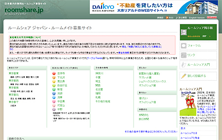 「ルームシェアジャパン」は、日本国内でルームシェアの相手を探すためのサイト。貸したい人、借りたい人の情報を無料で掲載し、マッチングの場を提供している。運営費用はサイト上の広告でまかなっている。