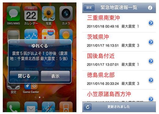 携帯電話会社が発表する一般向け緊急地震速報と異なり、利用者自身が測定対象の住所と通知を受ける震度(震度1~7以上)を設定するので、小さな揺れでも事前に予想震度を知ることができる。2010年11月のリリース以降、専用アプリのダウンロード件数は100万件を超えている。カテゴリは「天気」、対応OSはiOS 3.0以降。