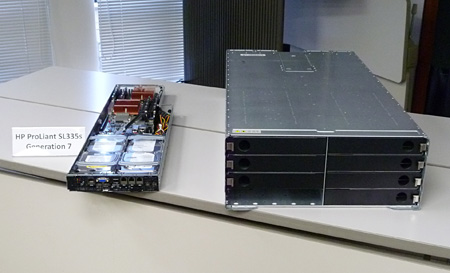 「SL335s G7サーバー」のプロセッサにはAMDのOpteron 4100シリーズを採用し、省電力と低価格を実現した。4Uシャーシに最大8ノード搭載できる。また、リモート管理チップ「iLO3」で、遠隔管理機能を支援する。