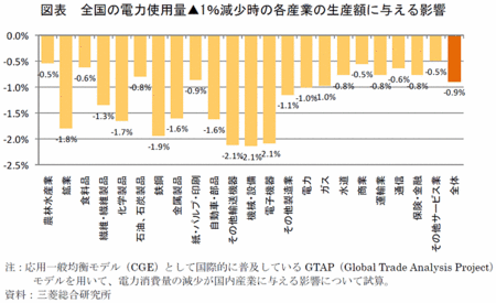 MRIは、実際に今夏の電力使用量は、変動要因が大きく不確定であると前置きしたうえで、「全国で前年同期比で、おそらく5%の減少には届かない」(MRI政策・経済研究センター主任研究員の武田洋子シニアエコノミスト)と推測する。電力使用量が7~9月期でおよそ仮に5%減であるとして試算すると、単純計算で生産額全体は期間内で4.5%減となる。