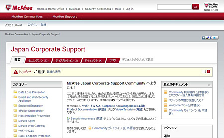 企業向け製品ユーザーのフリーディスカッションスペースを設け、サポート情報メールマガジン「マカフィー サポート通信」の配信やサポートQ&Aの更新情報、製品やパッチのリリース情報などを掲載する。マカフィー製品のユーザーでなくても登録でき、登録メンバーなら誰でもディスカッションスペースに投稿できる。