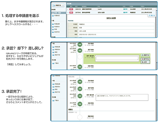 承認画面は、管理者・意思決定者が、直前のコメントや今後の決済フローを手早く確認しながら「承認」や「差し戻し」を迅速に行えるよう、画面の上から下に時系列でフローを表示し、ひと目で流れがわかるレイアウトを採用。rakumoシリーズの特徴であるシンプルな操作性、わかりやすく見やすい画面デザインを継承し、初めてワークフローを使うユーザーでも、迷わずに操作できる。