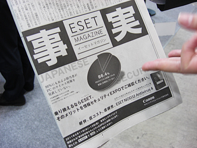 「ESET」は、ディストリビュータであるキヤノンITソリューションズがマーケティングを主導しながら販売している。ブースでは「実装」「歴史」「解決」「募集」という、インパクトの強い2文字で、来場者にメッセージを伝えている。「今年はESETのすぐれた技術を最適な形で導入できる『実装力』を強く訴えた」(セキュリティ企画部セキュリティ企画第一課の輿水直貴氏)とのことだ。法人向け製品拡販のパートナー「募集」も行っている。
