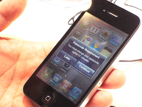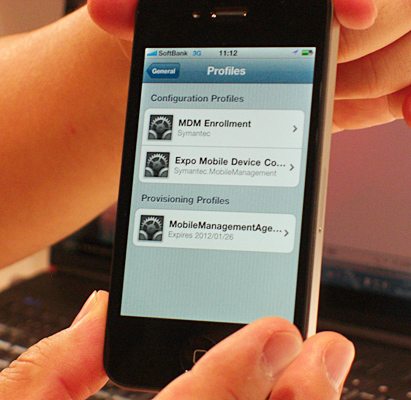 ブースでは「Symantec Mobile Management」の管理コンソールからiPhone、iPadにポリシーを適用するデモを見せてもらった。管理コンソールから、パスコードの変更と、YouTubeのような特定アプリケーションを使用できないように設定して配信すると、端末にただちにポリシーが適用されるデモだった。(鍋島蓉子)