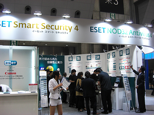 メールセキュリティゾーンに出展しているキヤノンITソリューションズは、メールフィルタリング/アーカイブ製品の「GUARDIANWALL」、ウェブフィルタリング製品「WEBGUARDIAN」などを展示。同社がとくに力を入れているエンドポイントセキュリティソリューション「ESET Smart Security」「ESET NOD32アンチウイルス」については、別に「ESET」単独でブースを設けて紹介していた。