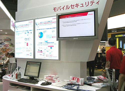 マカフィーは、「モバイルセキュリティ」「SaaS」「仮想環境/サーバー&ネットワーク セキュリティ」の3テーマで展示。広報の加藤英明氏は、「震災の影響で、モバイルやクラウドが注目されている。これらのキーワードに合わせてソリューションを提供できたらいい」と話した。モバイル展示コーナーでは、今年3月に発売したマルチプラットフォーム対応のモバイルデバイス管理製品「McAfee Enterprise Mobility Management」や、エンドポイントを守る仕組みとしてDLPソリューションなどを紹介している。