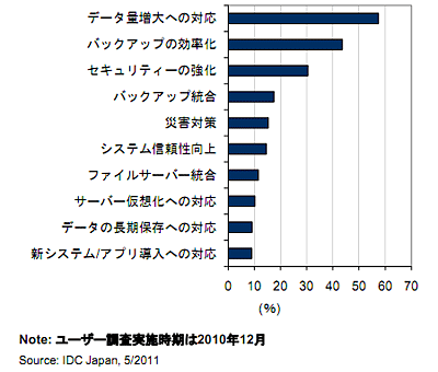 IDC Japanの森山正秋ストレージ/サーバー/HCP/PCsグループディレクターは、「調査は東日本大震災以前に行ったものだが、データ保護や災害対策に関連した項目が上位に入っている。震災や電力不足で、2011年はデータ保護や災害対策関連の優先順位が上昇する」と分析した。