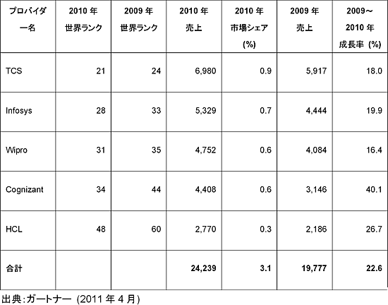 アーラップ・ロイ主席アナリストは、「2010年、インドのITサービス・プロバイダ上位5社は合計で45億ドルの成長をみせた。業界全体からみた場合、インドのプロバイダが単独で占める割合は非常に少ないものの、それらをグループとしてみると、市場に対して厳然とした影響力を有している。上位5社が全体の売上増加に占める割合は93.7%に上り、これまでと同様にリーダー・グループが後続グループを引き離すという構図に変わりはない。ただし、リーダー各社よりも小規模なプロバイダの市場シェアは、今後相応の伸びを見せるだろう」と分析している。
