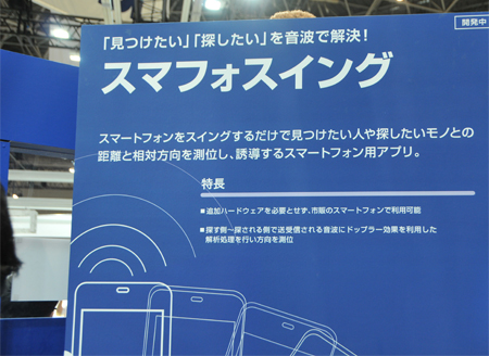 「スマフォスイング」は、探す側と探される側の間で送受信される音波に、相対的な速度によって音の高さが変化するドップラー効果を利用した解析処理を行い、方向を測位する。追加ハードウェアを必要とせず、Bluetoothを搭載した市販のスマートフォンで利用できるという。