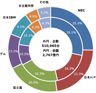 メーカー別シェアは、NECのトップは変わらず、富士通と日本ヒューレット・パッカード(HP)を加えた「3強時代」が鮮明になった。(ゼンフ ミシャ)