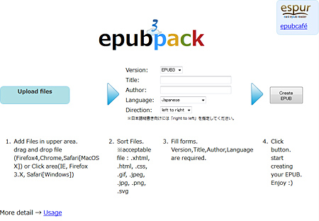 国際電子出版フォーラム(IDPF)が、今年5月23日に発表した「EPUB3.0」に対応したEPUBファイルを生成するクラウドサービス。ロードしたHTMLやCSSなどのファイルを素材として、EPUBファイルを自動生成する。すべての生成されたコンテンツが24時間、誰でも入手できる。