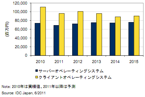 IDC Japan(竹内正人代表取締役)は、6月27日、国内オペレーティングシステム(OS)市場の2010年実績と、15年までの予測を発表した。