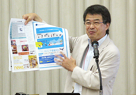 KRAには、カゴヤ・ジャパンのほか、ビジネスラリアート、フューチャースピリッツ、ブリッジコーポレーション、メディアウォーズ、Renbirdの6社が参加。現在は、ユーザーにKRAを知ってもらうために、『京都インターネット新聞』(季刊/紙媒体)を発行している。新聞の編集を担当するエディット・プラスの萩原展孝氏は、「ISPの存在を知らない方々に、認知してもらうことを目的に発刊した。紙媒体で市内でも頒布している」と発刊の経緯を語り、紙面の特徴を説明した。「紙面制作では、画像やデザインデータなどをISPなどのサーバーを介して作業している。その意味で、われわれ編集者はとくにISPを使うことが多い」と、安価で手軽に利用できるISPをアピールした。