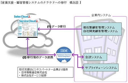 日本IBMのアプリケーション連携テンプレート「IBM WebSphere Cast Iron」を活用することで、既存システムからセールスフォースの営業支援・顧客管理クラウド・サービスへのデータ移行に加え、移行後のデータ連携が可能になる。個別にプログラム開発した場合、数か月程度かかるところを、10日間程度の短期間で移行を実現する。
