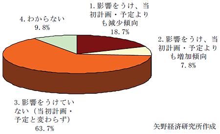 東日本大震災やそれに伴う景況悪化などの影響について、「影響をうけていない(当初計画・予定と変わらず)」とする回答が63.7%、「影響をうけ、当初計画・予定よりも減少傾向」が18.7%、「影響をうけ、当初計画・予定よりも増加傾向」が7.8%だった。