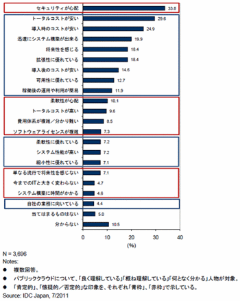 国内企業のパブリッククラウドに対する印象は、セキュリティに対する懸念を除いて、肯定的な意見が多くなっていることがわかった。なかでも、「コスト」「迅速性」「拡張性」に対する評価が高くなっている。これらの項目は、クラウド事業者が利点として訴求している内容であり、企業はその優位性を評価しているといえる。一方、セキュリティに関しては、SaaSやパブリッククラウドが登場したときから議論になっている課題だが、懸念は払拭されていない。