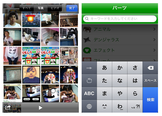 有料版なら合成写真をiPhoneのカメラロールに保存できる(左)、パーツはキーワードで検索可能(右) これまでAndroid向けの有料/無料版と、iPhone向けの無料版「DrCrop Lite」をリリースしている。今回の有料版iPhoneアプリには、無料版にはないローカル保存機能を実装。作成した合成写真をブログに載せたり、メールに添付したりできる。また、合成パーツの移動・縮小・拡大だけでなく、Android版ではできなかったパーツの回転に対応する。対応OSはiOS 3.0以降。
