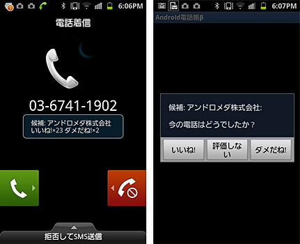 通常、携帯電話に電話がかかってきたとき、個人のアドレス電話帳に登録されている電話番号なら登録名で表示し、それ以外は番号だけを表示する。「アンドロイド電話帳β+」では、全国の企業電話番号と連動することで、相手が不明な電話でも、相手が固定電話の場合は企業・店舗候補名を表示。さらに、電話後に表示する評価ボタンを押せば、その電話番号の評価を蓄積する。