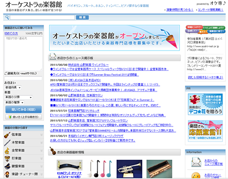 「オーケストラの楽器館」のトップページ 楽器を探しているユーザーが、インターネットから、全国の楽器店で「店頭販売中」の楽器情報を閲覧できるサイト。事前に情報を収集してからお店に行くことができ、効率的な買い物ができる。