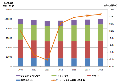 ITマネジメント市場は、11年も前年とほぼ同じ規模で推移。震災で深刻なダメージ受けた企業を除き、IT運用業務の効率化・コスト削減を目的としたITマネジメント・サービスの利用が続く。12年以降も、引き続き共同センター利用の増加やSaaS、クラウド・サービスの浸透、新しいクライアント端末の資産管理ニーズが見込まれるが、価格やサービス・レベルの見直し、サービスのコモディティ化で契約当たりの金額が縮小する傾向にあり、15年までの市場成長は緩やかになると予測している。