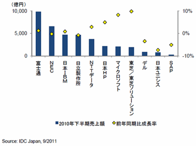 10年下半期の前年同期比成長率は、富士通が1.2%、NECがマイナス0.2%、日本がIBM0.9%、日立製作所がマイナス0.8%、日本HPが4.9%となった。専業ベンダーは、10年下半期の前年同期比成長率がデルがマイナス3.4%、SAPがマイナス5.1%と依然マイナス幅が大きく、回復には時間を要するとみている。