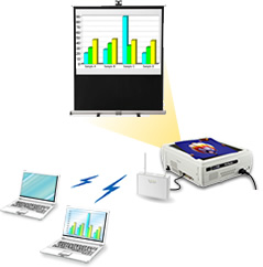 315万画素書画カメラ機能を内蔵し、印刷物や立体物をそのまま映し出すことができるインテリジェントプロジェクタ。一般のプロジェクタと同様に、パソコン画面やビデオ・DVDなどの映像も投映できる。新たに無線LAN機能を搭載し、パソコンとのワイヤレス接続ができるようになった。また、複数の参加者が持ち寄ったパソコンを、煩雑なケーブル差し替えなしで切り替え表示することができる。1台のパソコン画面を無線で最大6台まで同時に表示できる。
