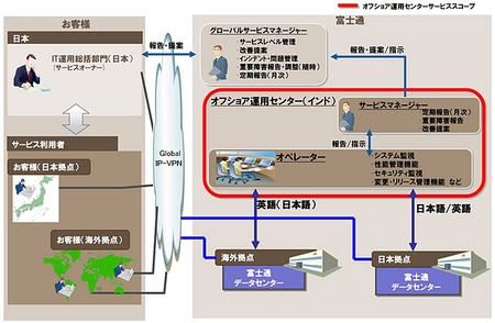 富士通は、これまでインドやフィリピン、ロシアのオフショア拠点から欧米向けに英語でシステム運用サービスを提供してきた。そのノウハウを活用し、FCIPLが日本語と英語によるサービスの体系を整備。日系企業向けにも提供する。価格は、個別見積もり。初年度に10社の導入、33億円の売り上げを目指す。