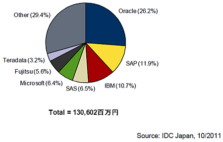 2010年の国内BAソフトウェア市場のベンダーシェアは、首位のオラクルが26.2%、2位はSAPで11.9%、3位はIBMで10.7%だった。オラクルは、約45%の売り上げ構成比を占めるデータウェアハウスマネージメントプラットフォームのセグメントで、シェア46.8%を保持。2位のSAPは、パフォーマンスマネージメント&アナリティクスアプリケーションのセグメントとBIツールのセグメントでは首位を堅持している。
