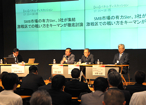 NECネクサとJBCC、FJMの3社は、SMB市場を得意とする大手SIer。パネルディスカッションは、各社が得意とするSMB市場の開拓に向けた施策に始まり、クラウドが普及するなかでの生き残り策、海外戦略、パートナー戦略まで、話は多岐にわたった。