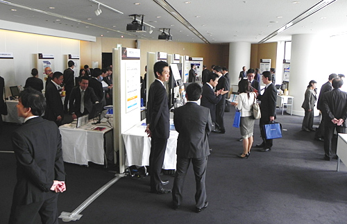 東京・港区の六本木アカデミーヒルズで開催中の「BCN Conference」。正午には展示会場が開場し、出展社17社が自慢のITソリューションを来場者に披露した。出展社はメーカーやディストリビュータが中心で、来場者の多くはSIerなどITシステムの“売り手”。説明担当者は、来場者に向けて熱心に自社のITソリューションの優位性を訴えた。