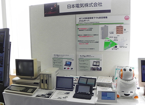 NECは往年の名機(左)のほか、コミュニケーションロボットのPaPeRo (右端)を展示した。
