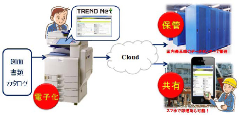 福井コンピュータのクラウド型顧客管理&データ保管サービス「TREND Net 2011」のクライアントとしてリコーのデジタル複合機(MFP)「imagio シリーズ」を活用することで、パソコンを介さずに図面や書類を登録できる連携システム。リコーが推進する「Operius(オペリウス)」の開発パートナーである福井コンピュータが、リコーの技術協力を受けて開発した。MFPの操作パネル上に表示される「TREND Net 2011」の操作画面から顧客や物件名を選択し、図面や仕様の打ち合わせ時の記録文書を電子化・登録する。