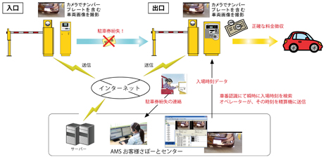 駐車場入口に設置したカメラで、ナンバープレートを含む入場車両の画像を撮影。画像データをインターネット経由で24時間365日稼動する「AMSお客様さぽーとセンター」の駐車券紛失対応システムサーバーに自動送信。サーバーは、画像とともに自動検出したナンバープレート情報と入場時刻をデータベースに記録する。駐車場出口でも車両を撮影して、ナンバープレート情報からその車両の入場時刻を瞬時に検索する仕組みだ。