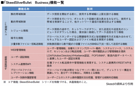 ソフト開発のSkeed(明石昌也社長)は、超高速のファイル転送ソフト「SkeedSilverBullet Business」を10月31日から販売を始める。通信帯域が不安定になりがちな国境を越えるグローバルネットワーク回線環境で、大容量ファイルの送受信を、従来のFTP(File Transfer Protocol)比で最大30倍にできる「SkeedSilverBullet」シリーズの企業向けエディション。