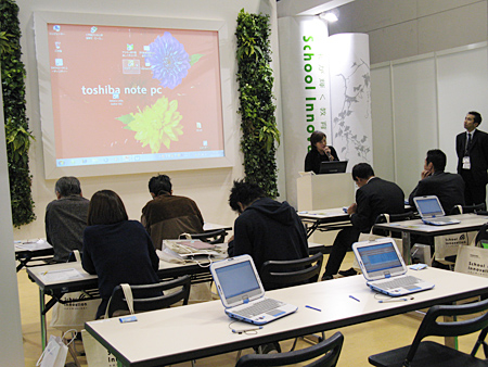 「スクールイノベーション体験コーナー」では、東芝情報機器が提供する学校向けパソコンを使った電子教科書などの実演を行っている。