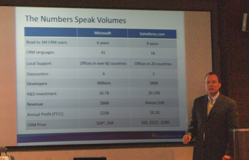 「Dynamics CRM Online」のすぐれている点として、とくに強調したのが、1ユーザー月額44ドルいう価格だ。「Salesforce.com」を引き合いに出して、「2分の1から3分の1の価格で、充実した機能を備えたCRMを利用できる」とアピールした。「Salesforce.com」との比較では、ユーザー数が100万人を超えるまでにかかった期間が3年早かったことなども紹介した。