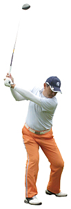 | 念願の優勝を果たしたキューアンドエー金川社長のティーショット |