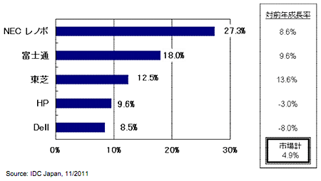その後は、シェア18.0%の富士通、12.5%の東芝、9.6%の日本ヒューレット・パッカード、8.5%のデルと続いた。シェアの上位3社が前年同期に比べてプラス成長し、4位と5位の両社が、前年同期の出荷台数を下回った。