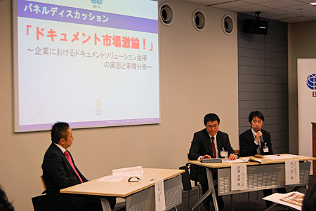 続くセッションでは、「ドキュメント市場激論! 企業におけるドキュメントソリューション活用の実態と市場分析」と題したパネルディスカッションを開催。パネリストに、ビジネス機械・情報システム産業協会(JBMIA)のドキュメントマネージメントシステム部会の伊藤泰樹氏と、矢野経済研究所の情報通信・金融事業部の河上真一氏を招き、モデレータを『週刊BCN』編集長の谷畑良胤が務めた。