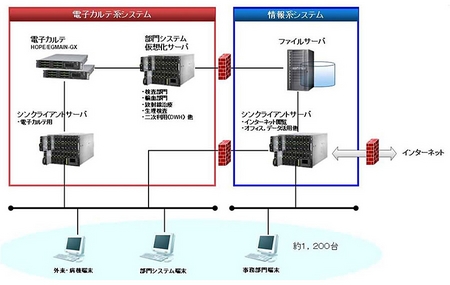 新システムでは、富士通の電子カルテシステム「HOPE/EGMAIN(ホープ/イージーメイン)-GX」を中核に、約35部門のシステムを連携させた。セキュリティ確保のため、電子カルテシステムとインターネットにつながる情報系システムを、完全に分離した二つのクライアント仮想化環境に分けて管理している。