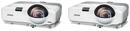 超短焦点プロジェクター「EB-435W」(左)と「EB-430」 「EB-435W」「EB-430」は、通常のプロジェクターの約半分の距離で映像を投写できる超短焦点レンズを搭載。「EB-435W」はスクリーンから83cm、「EB-430」は89cmの距離でワイド80型の映像を映し出すことができる。コントラスト比は3000:1。