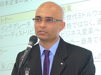 ヴィヴェック・マハジャン常務執行役員ソフトウェア事業担当は、「新世代ミドルウェアは、国内で3兆5000億円の市場規模。そのなかで、当社がダントツのポートフォリオをもっている」とアピール。「プロジェクト内容に応じて最適なパートナーと組み、粗利など、パートナーのメリットを含めてユーザー企業のニーズに対応していく」と、販社とのパートナーシップの強化でシステム案件を獲得する考えを示した。