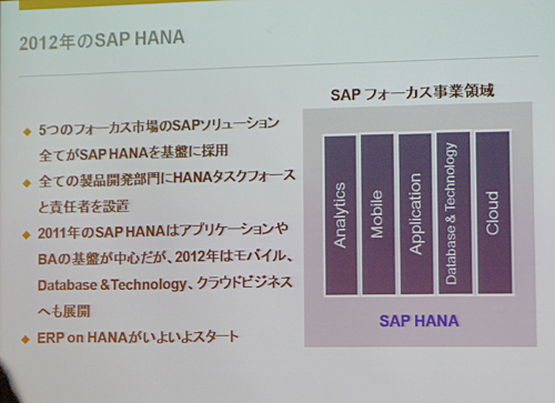 「HANA」は、五つのフォーカス市場のSAPソリューションすべてが基盤として利用。すべての製品開発部門に「HANA」タスクフォースと責任者を設置した。また、2011年の「HANA」はアプリやBAの基盤が中心だが、2012年はモバイルやデータベース、クラウドにも展開する。