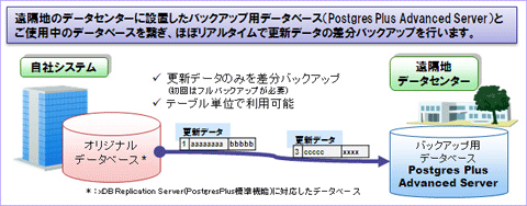 業務遂行に必要なデータベースを、ほぼリアルタイムでデータセンター(DC)にバックアップすることによって、大規模災害発生時などの経営リスクを最小限に抑えるサービス。ファイル単位やディスク単位ではなく、データベース単位でのバックアップ方式を採用し、更新データをほぼリアルタイムに差分バックアップすることができる。
