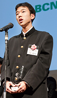 宮城県工業高校の高橋翔哉さんが受賞者代表として挨拶。東日本大震災で1か月以上も学校が閉鎖、部活動も休止を余儀なくされたが、同校の情報研究部は高校プロコンで三連覇、高橋さんはU-20プロコンで経済産業大臣賞を受賞するという素晴らしい成績を収めた